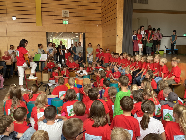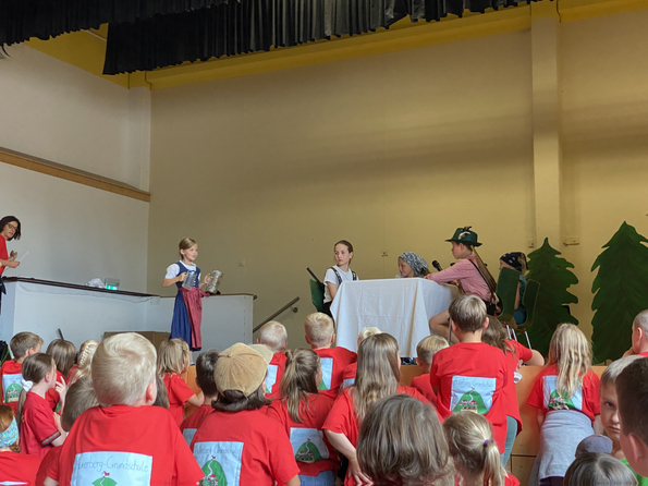Am Ende der Woche fand dann unser Schulfest mit Vernissage statt, wo wir vor neugierigen Besuchern unsere Werke, Musik, Geschichten und sogar einstudierte Theaterstücke präsentieren durften. Bei der Gelegenheit konnten wir auch gleich unseren Gästen unsere coolen neuen Schul-T-Shirts zeigen. Ab jetzt kann man bei jedem Ausflug und Fest alle Auerberg-Grundschulkinder direkt erkennen.